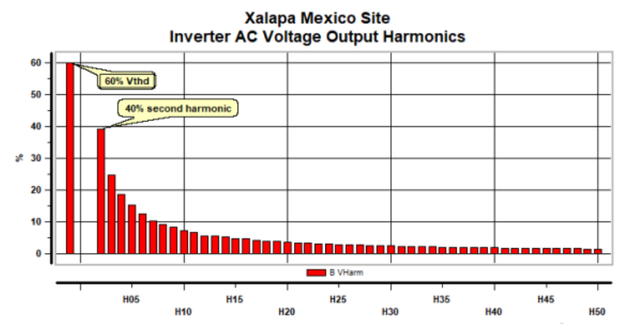 2. Severe Harmonic Violations: PQ measurements indicated inverter AC output harmonics far exceeded IEEE 519 limits, with Total Voltage Harmonic Distortion (Vthd) reaching 60%. Unusual even-order harmonics (rare in most power systems) were also detected. Excessive harmonics can cause overheating in inductive equipment (e.g., transformers), resonance, elevated neutral currents, overvoltage, and eventual system shutdown—resulting in significant financial losses.