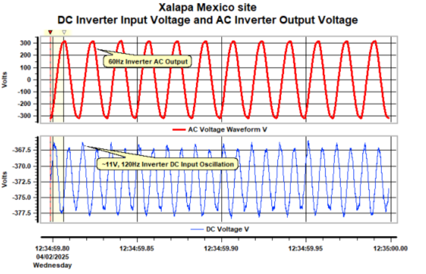 3. Abnormal DC-Side Oscillation: The inverter DC input exhibited an 11V oscillation at 120Hz (twice the grid's fundamental 60Hz frequency), likely linked to second-order harmonics on the AC side. This oscillation undermines inverter stability and accelerates component degradation. This case underscores that solar projects without PQ evaluation risk hidden operational hazards. Professional testing identifies these issues early, providing a data-driven basis for corrective action.