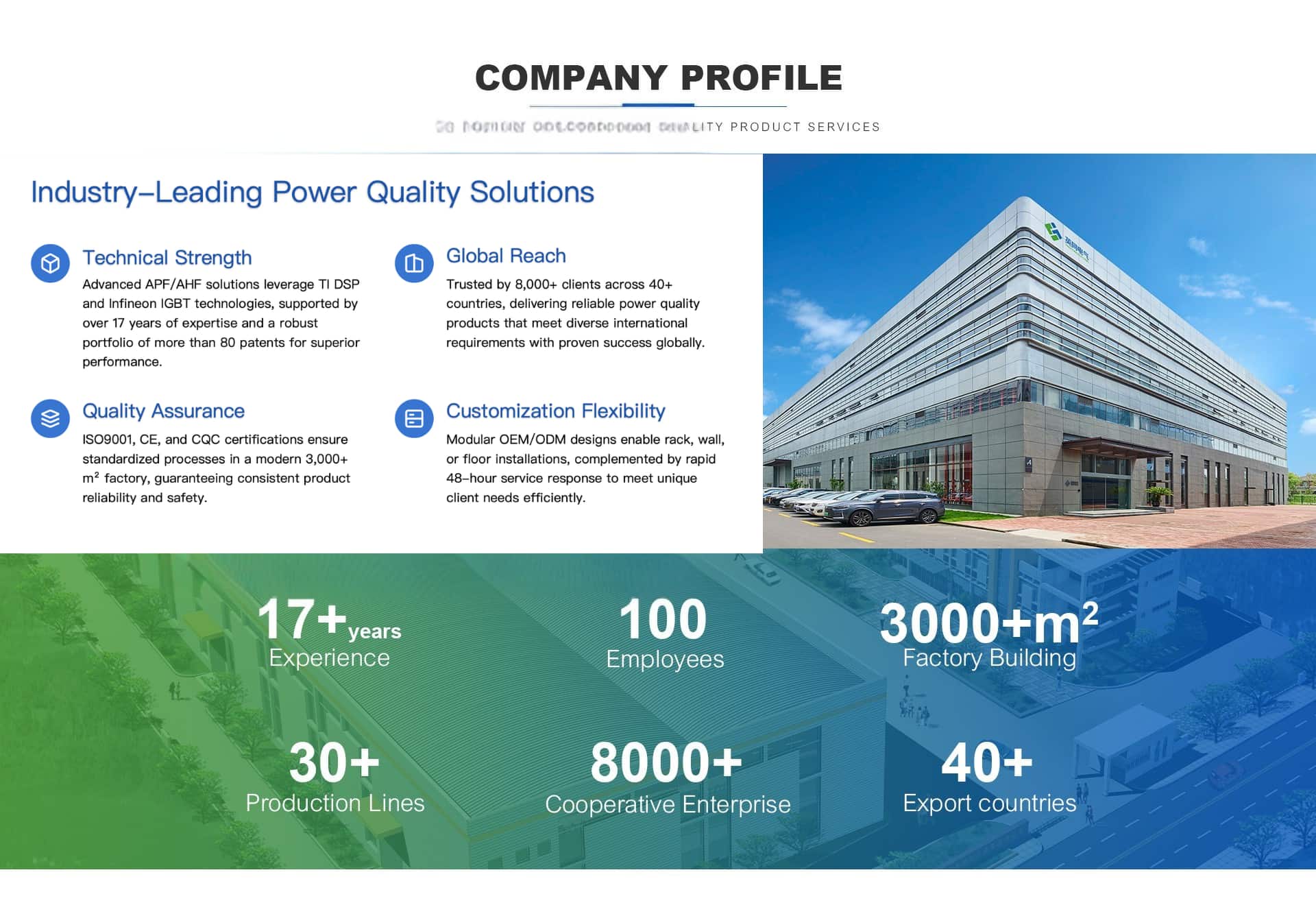 Acerca de Shanghai Yingtong (YT) Electric Shanghai Yingtong (YT) Electric Co., Ltd es pionera en soluciones de calidad de energía, especializada en I+D y fabricación de Filtros de potencia activos , Generadores de variables estáticas , y Sistemas de almacenamiento de energía Con más de 15 años de experiencia, YT Electric ofrece soluciones energéticas inteligentes, eficientes y limpias a industrias de todo el mundo, incluidos centros de datos, hospitales y plantas de fabricación.